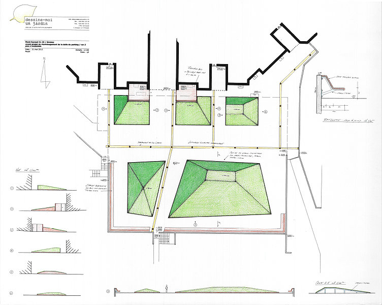 Les contraintes à respecter étaient les suivantes: accès permanent pour tous véhicules de déménagements ou de secours; aménagements sur dalle; et si possible limiter l’entretien…!