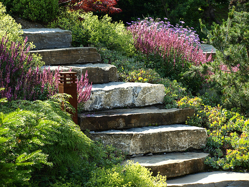 La pierre naturelle, du grès de Fayaux de Blonay, est omniprésente dans le jardin sous forme de muret en pierre sèche ou d’escalier sauvage.