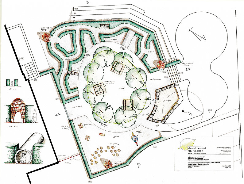 Le choix s’est porté sur une grande pelouse centrale flanquée de tables et bancs pour les goûters, un labyrinthe conçut avec des haies de troènes et agrémenté de tipis en saules, un coin sable et un coin jeux avec des bascules.